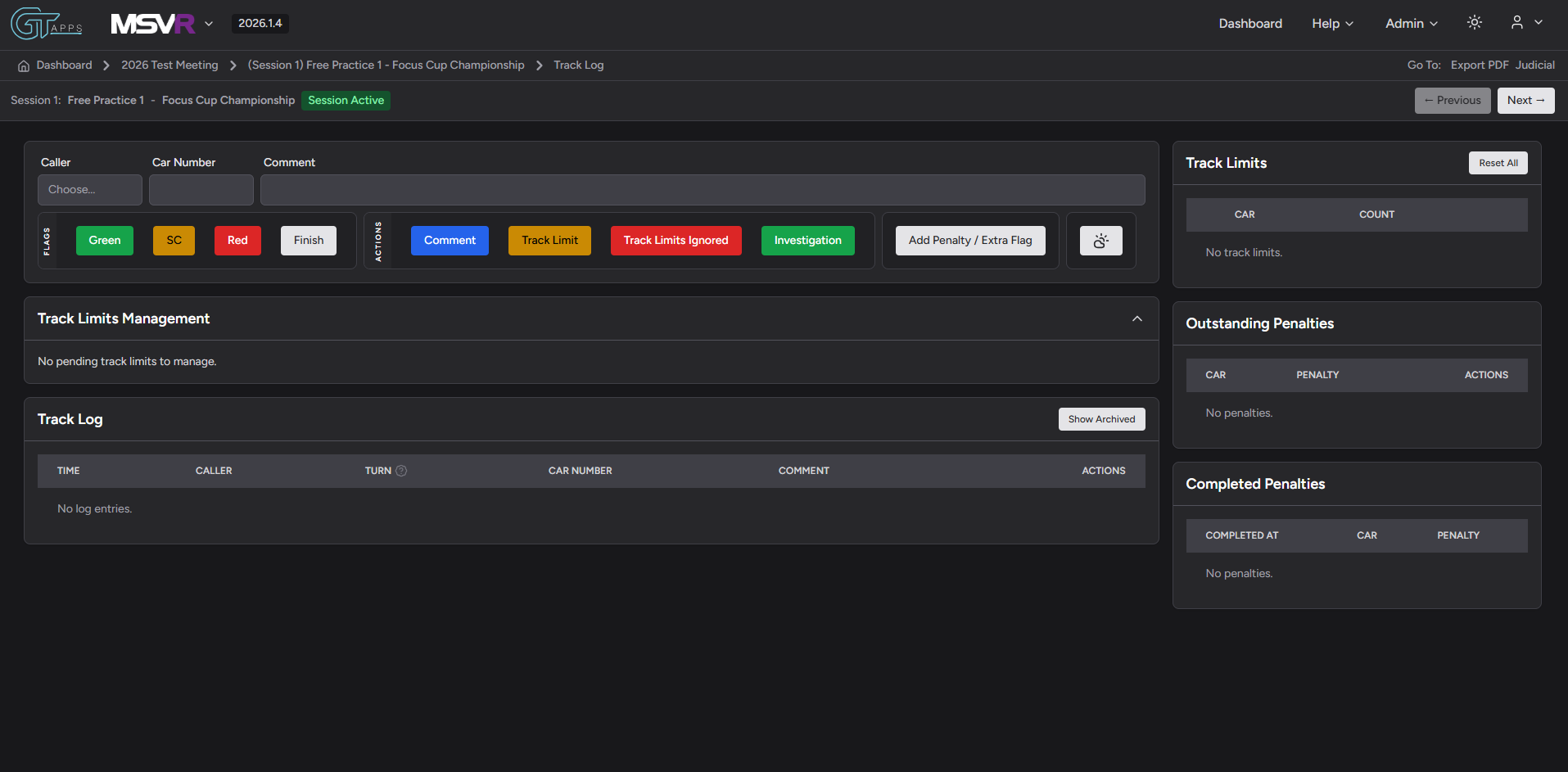 Log all activity on track including track limits, penalties, weather, investigations.